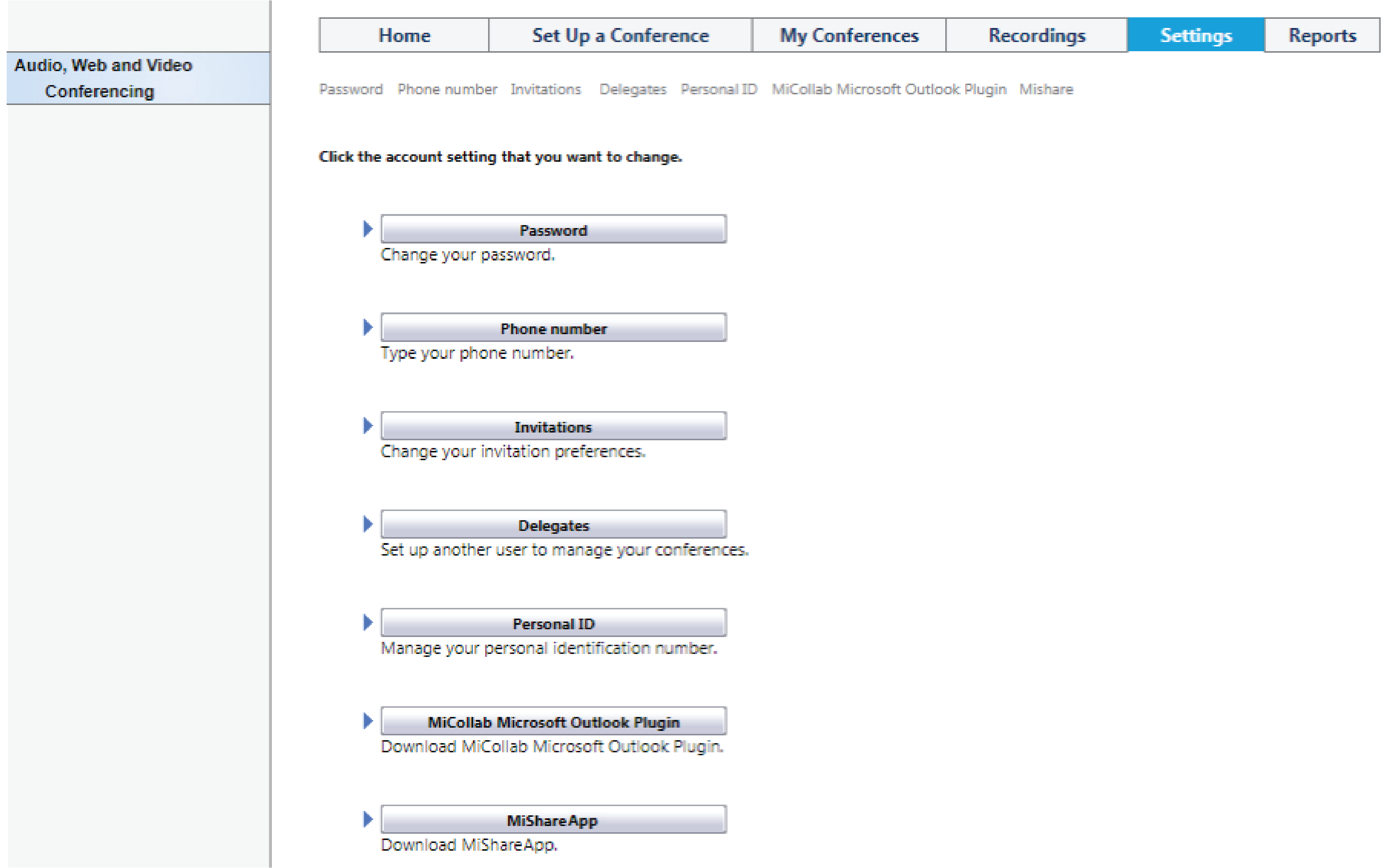 Account Settings allows you to view and change your MiCollab Audio, Web and Video Conferencing account settings. All accounts are created with default values, however, you can customize these account settings.