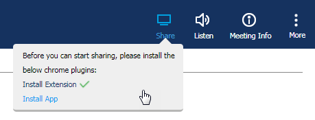 To initiate sharing for the first time, you must install the MiCollab Audio, Web and Video Conferencing Web sharing application and the extension on your Chrome browser. The application and the extension are available from the Chrome Web Store. You must manually install the application and the extension. You need to install these only once.