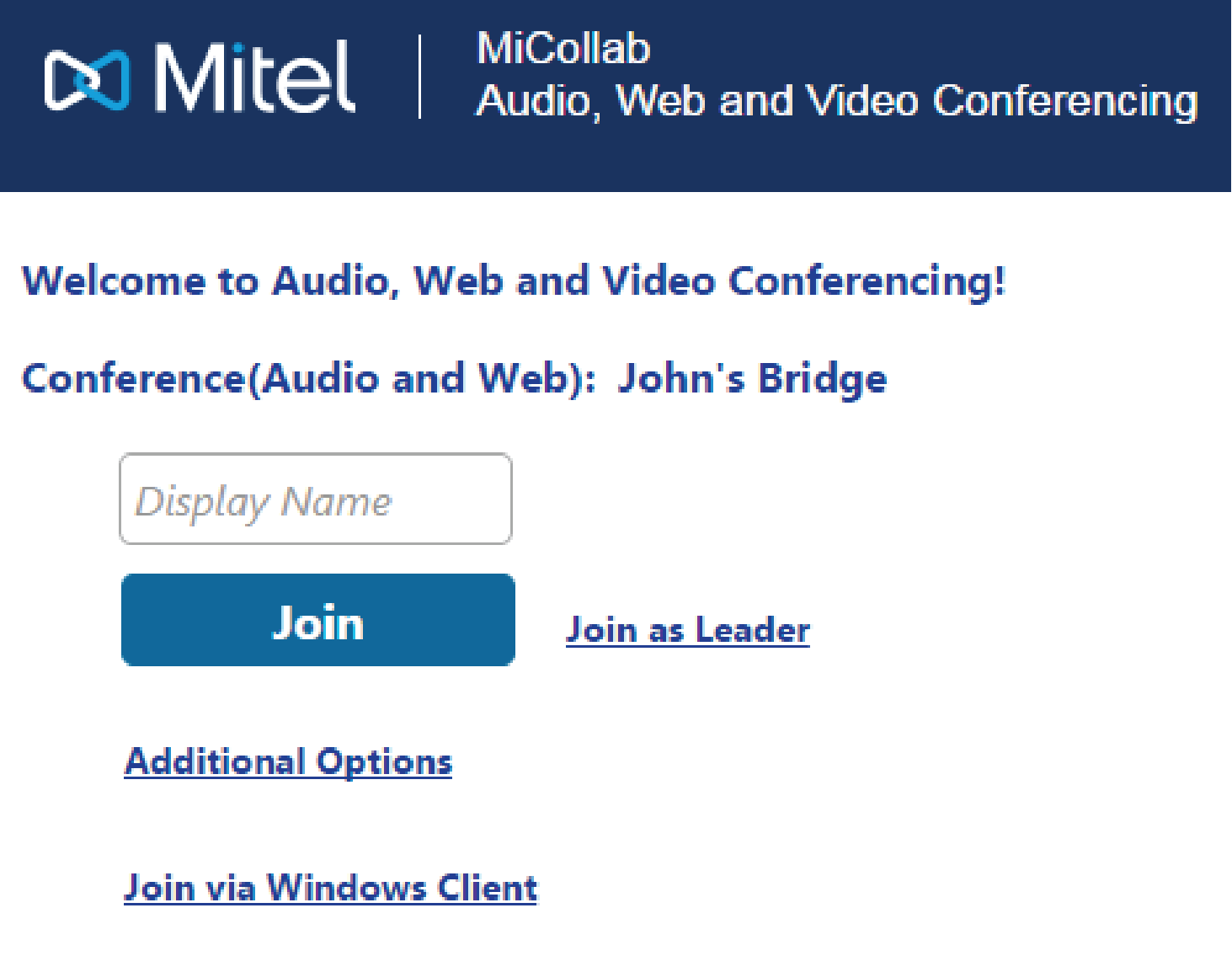 Click the Join Meeting link provided in the Leader's invitation e-mail. You can also copy the Join Meeting link in the e-mail or copy it directly from the MiCollab Audio, Web and Video Conferencing web page.